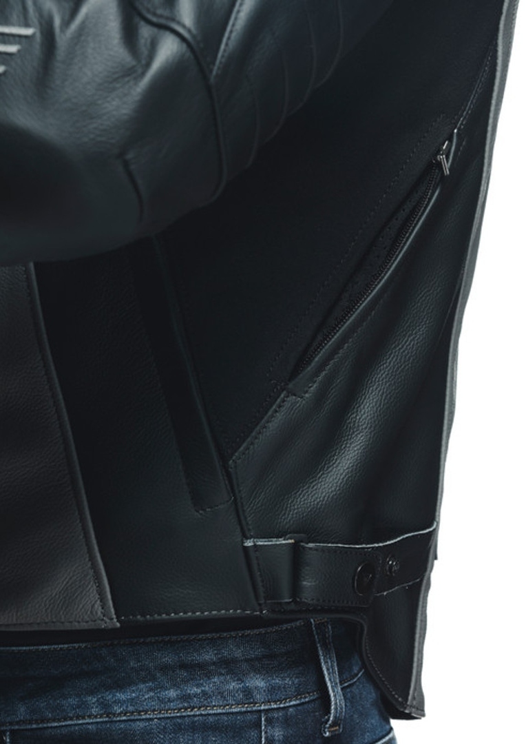 This Dainese patented technology has raised safety and comfort to new levels: it consists of one large panel in leather with elasticated bellows stretching perpendicularly in two directions, width and length, offering the wearer greater freedom of movement in the kidney area (when hunched over the fuel tank) as well as in the chest area and arms.